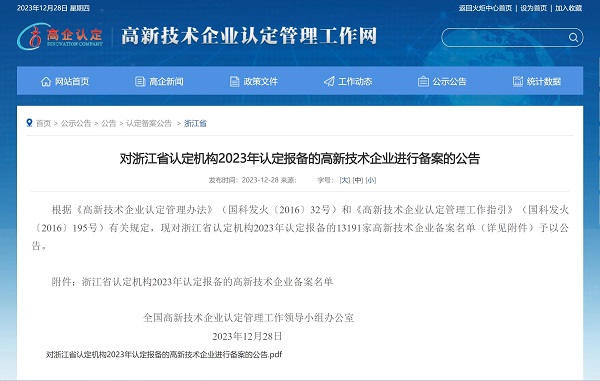 2023年12月28日,全國高新技術企業(yè)認定管理工作領導小組辦公室發(fā)布《對浙江省認定機構(gòu)2023年認定報備的高新技術企業(yè)進行備案的公告》,中國能源工程集團有限公司(以下簡稱“中國能源工程集團”)所屬中清能源(杭州) 有限公司...